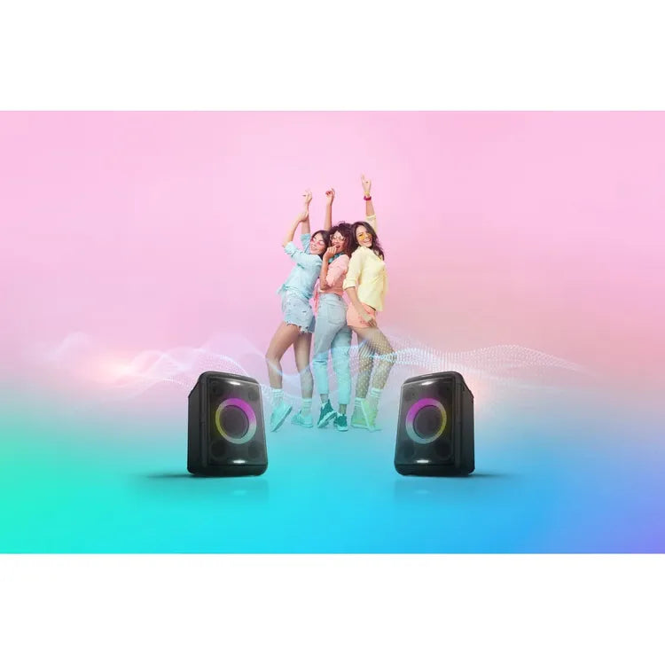El Panasonic SC-BMAX5 Negro es un parlante portátil tipo party speaker que combina potencia, movilidad y estilo. Con 75 W RMS cuando está conectado a corriente, woofers + tweeters, efectos de luces integrados y batería recargable para unas 9 horas de uso (según volumen y ajustes). Perfecto para fiestas en casa, reuniones al aire libre, karaoke espontáneo, o simplemente disfrutar música sin depender de enchufes.
